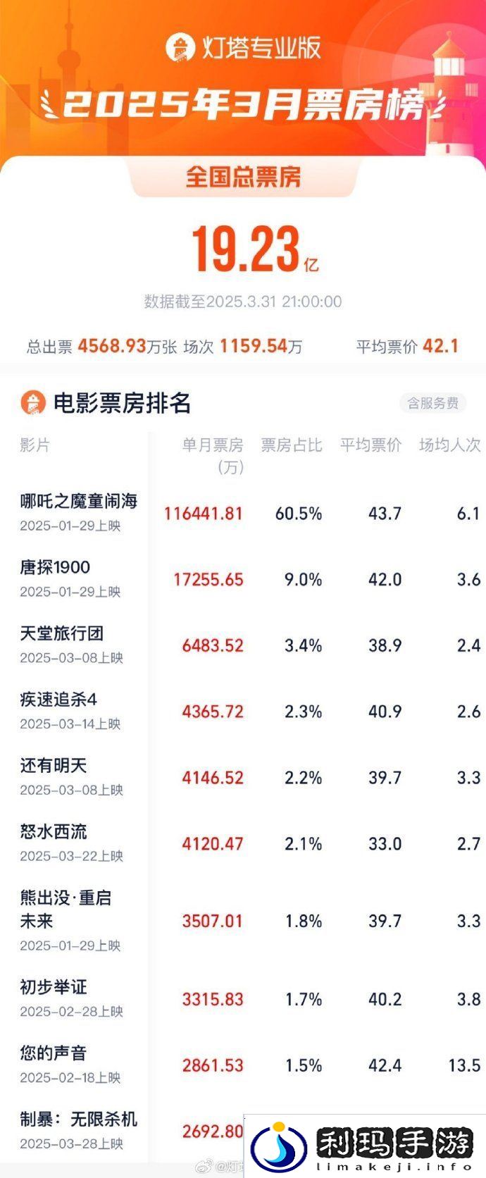 本站 3 月 31 日消息,据灯塔专业版数据,截至 3 月 31 日 21 时,2025 年 3 月票房 19.23 亿,《哪吒之魔童闹海》成为 3 月票房冠军,同时连续 3 个月获得月度票房冠军。