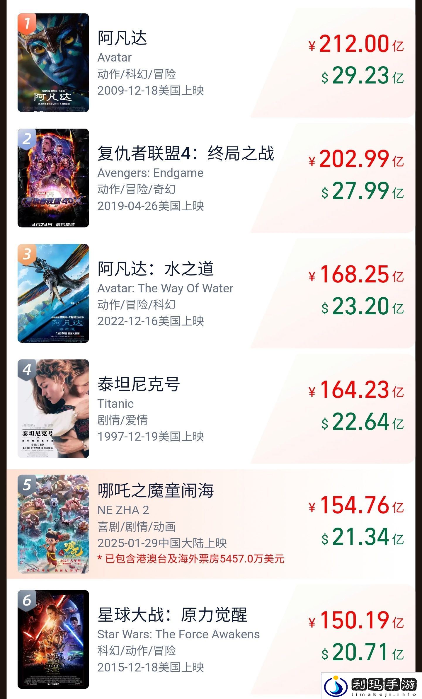这部春节档影片于今年 1 月 29 日上映,目前全球票房已经达到了 154.76 亿,暂列影史第五。排在该影片前面的是 1997 年上映的《泰坦尼克号》,其票房为 164.23 亿。而《哪吒之魔童闹海》将延长上映至 4 月 30 日,也就是说还有大概一个月的追赶时间。