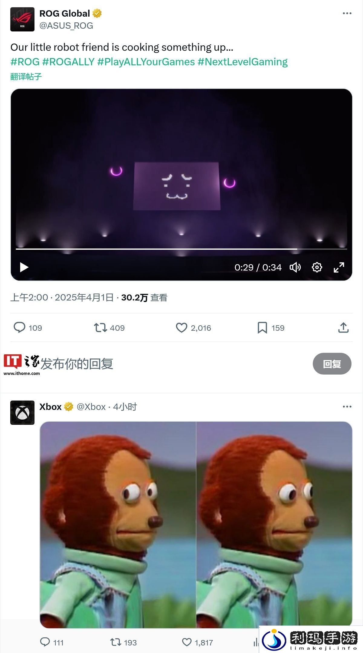 本站 4 月 1 日消息,华硕 ROG 玩家国度官方账户今日在 X 平台预热新款 ROG Ally 系列掌机设备,值得注意的是微软 Xbox 官方也在该动态下方进行了玩梗式回应,预计新设备即此前传闻中的双方合作款 Project Kennan。