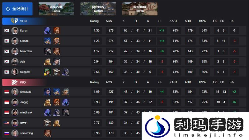 图一GEN选择莲华古城,Karon的幽影表现出色砍下24杀和287 ACS,GEN上下半场攻守俱佳、稳扎稳打,以13-10先下一城。foraskeN空砍21杀。