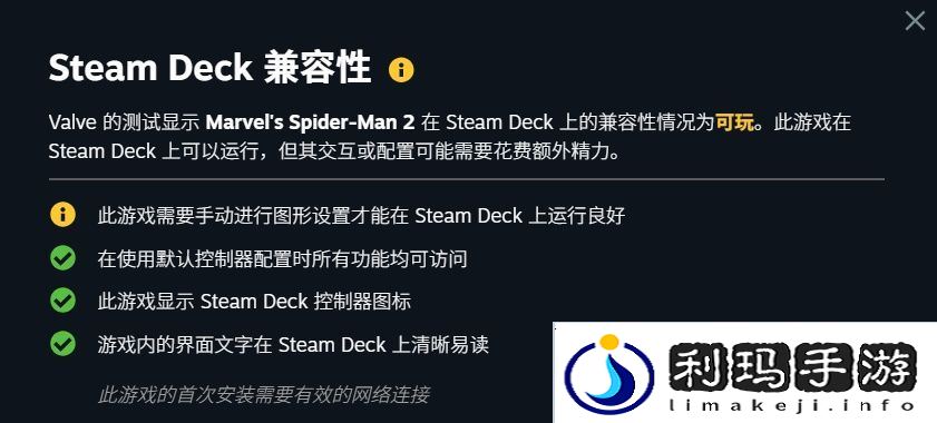 然而一个月后,Valve 将游戏的 Steam Deck 评级降低了一个级别。如下图所示,现在《漫威蜘蛛侠 2》在 Steam Deck 兼容性评级屏幕上显示为“Playable(可玩)”状态,表示“此游戏需要手动进行图形设置才能在 Steam Deck 上运行良好”。
